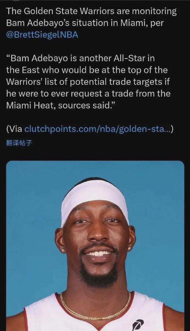 美媒ClutchPoints对此表示,阿德巴约是一个更年轻更全能的追梦格林,但热火对他很是看重,于是勇士必须提供极其丰厚的筹码,才有机会将其得到。