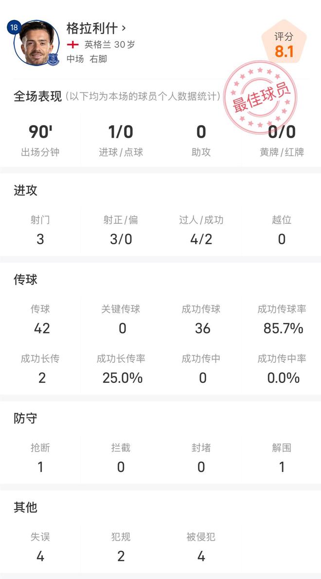 此役,埃弗顿攻击手格拉利什首发并踢满全场,在第93分钟攻入绝杀进球,3次射门全部射正,4次尝试过人两次成功,42次传球,成功率85.7%,防守端贡献1次抢断和1次解围,还有4次被对手侵犯,赛后机器评分8.1分。